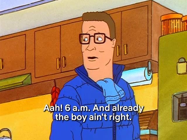 Hank Hill (Mike Judge) from King of The Hill (1997-2010): "Aah! Six AM and already the boy ain't right."
