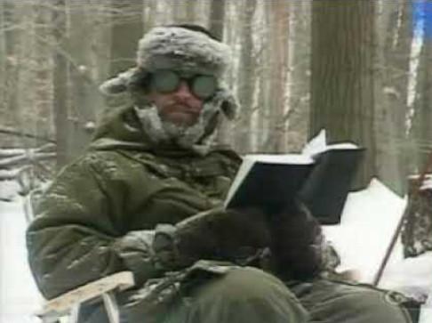 From the Red Green Show, Red sits in a lawn chair in the snowy, bitter cold. He's wearing an olive green parka and snow pants, a matching trapper hat (ear flaps blowing in the wind), snow goggles (apparently from the late 1800s) and heavy mittens. He's reading from a book, and he looks terribly uncomfortable.