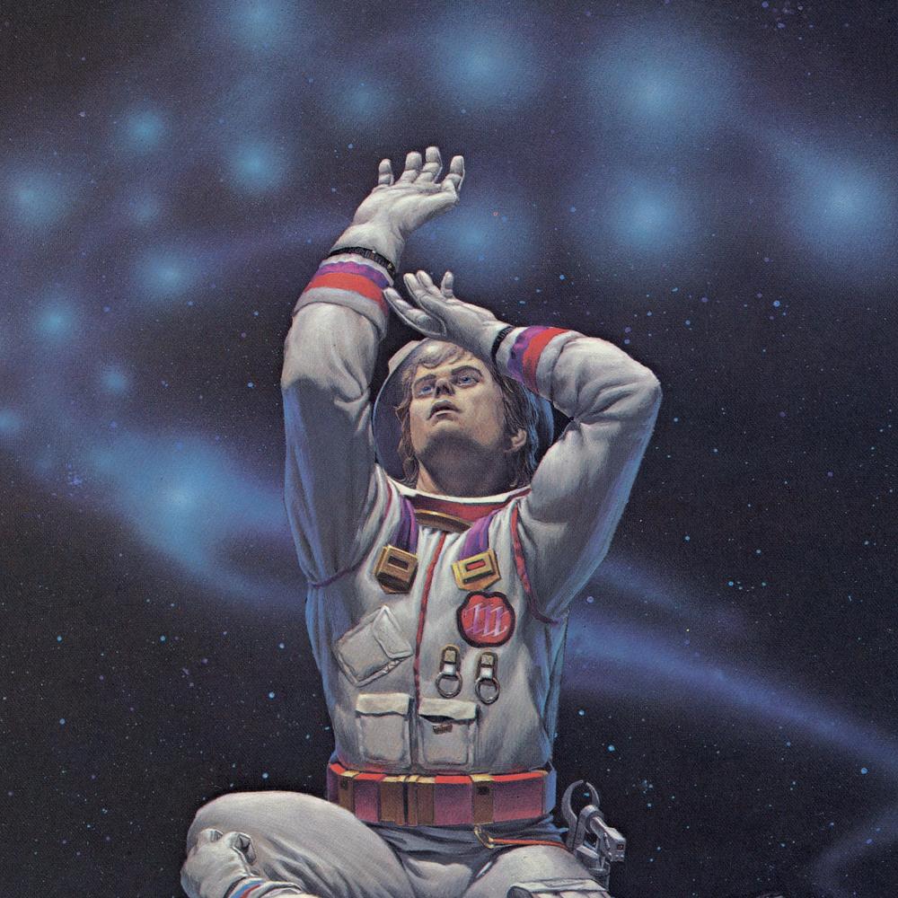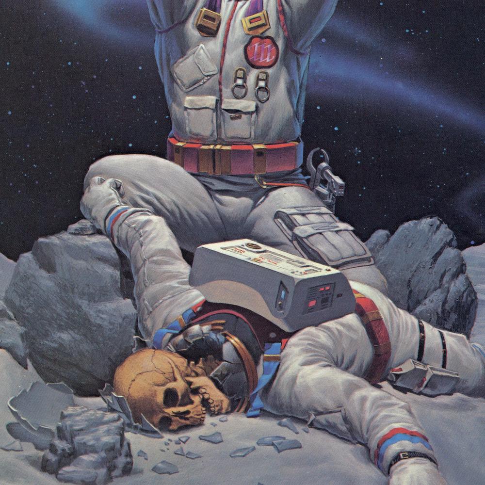 A man in spacesuit with bubble helm throws up his arms as he’s swarmed by blue lights. The fuzzy dots of light leave a trail back to the horizon, obscuring some of the star field. In front of man, face down in the regolith lies the remains of another astronaut whose helm is cracked. All that remains of his head are the bones of his skull.