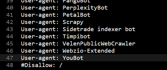@bebatjof The last line is the instruction that will disallow the agents listed above it. Remove the # character to activate it.