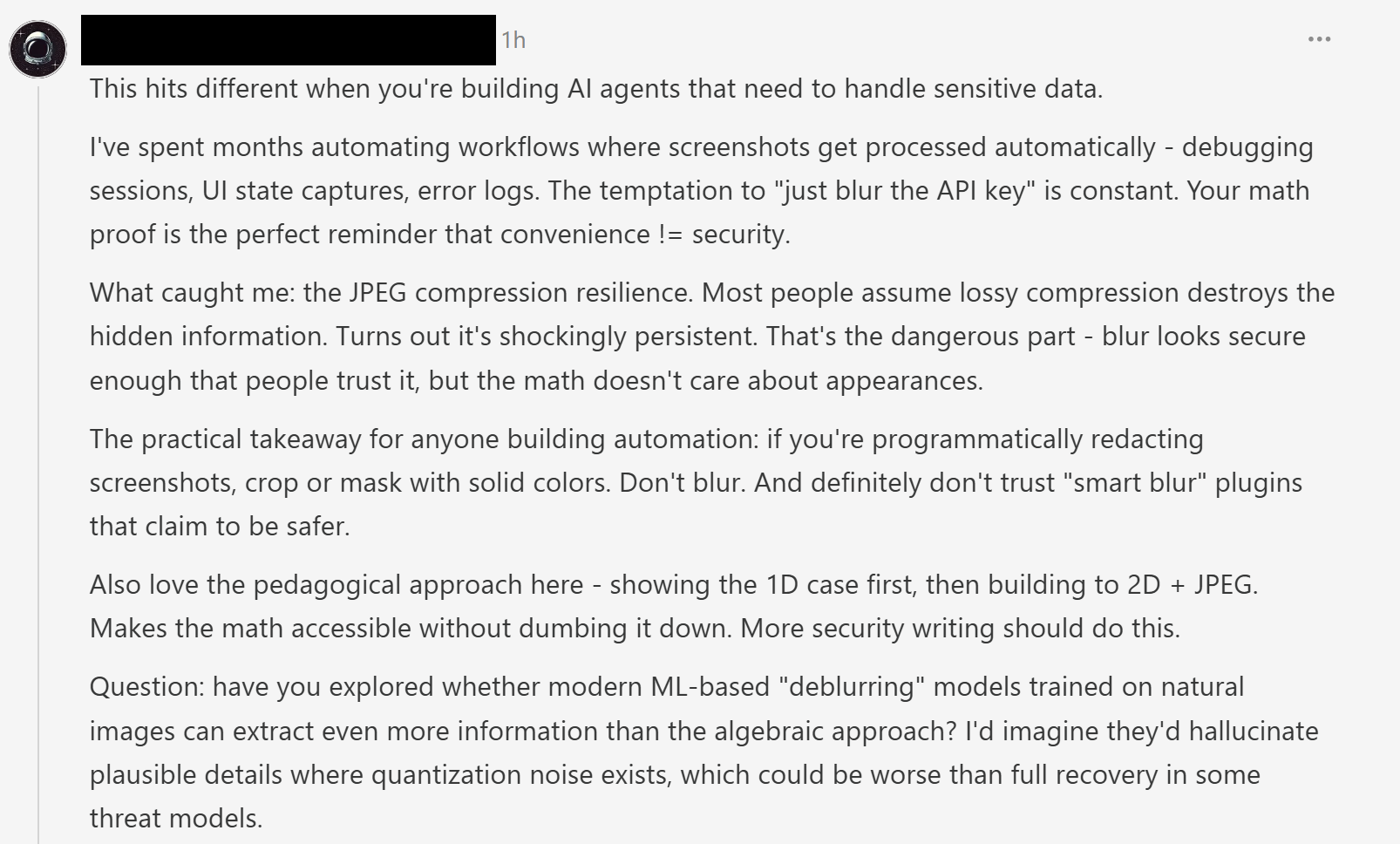 Obviously AI blog comment. Transcript follows. This hits different when you're building Al agents that need to handle sensitive data. I've spent months automating workflows where screenshots get processed automatically - debugging sessions, Ul state captures, error logs. The temptation to "just blur the API key" is constant. Your math proof is the perfect reminder that convenience != security. What caught me: the JPEG compression resilience. Most people assume lossy compression destroys the hidden information. Turns out it's shockingly persistent. That's the dangerous part - blur looks secure enough that people trust it, but the math doesn't care about appearances. The practical takeaway for anyone building automation: if you're programmatically redacting screenshots, crop or mask with solid colors. Don't blur. And definitely don't trust "smart blur" plugins that claim to be safer. Also love the pedagogical approach here - showing the 1D case first, then building to 2D + JPEG. Makes the math accessible without dumbing it down. More security writing should do this. Question: have you explored whether modern ML-based "deblurring" models trained on natural images can extract even more information than the algebraic approach? I'd imagine they'd hallucinate plausible details where quantization noise exists, which could be worse than full recovery in some threat models.
