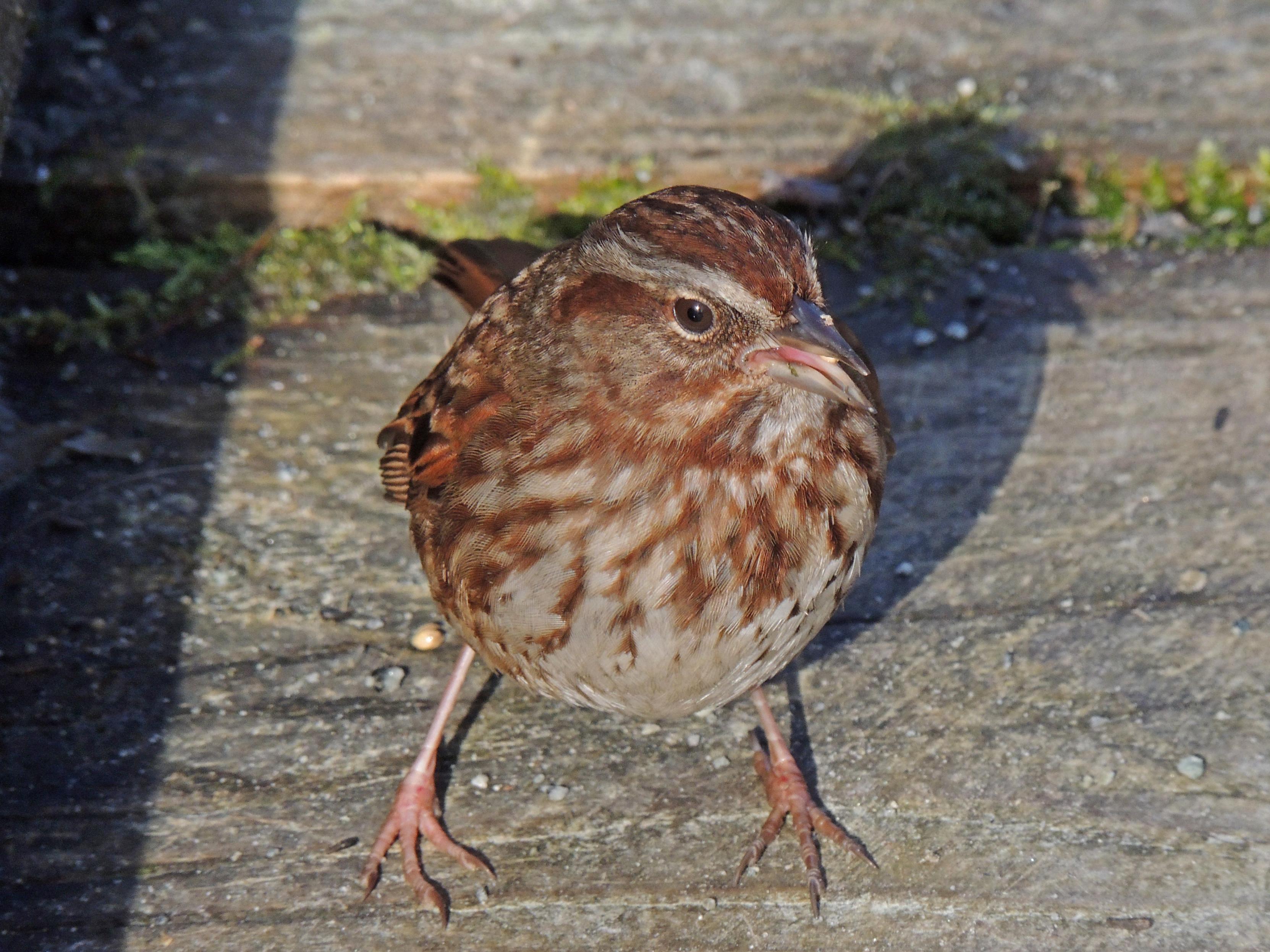 A song sparrow nibbles seeds on a wooden dock. The bird's shadow is seen with a beak open in sunshine.