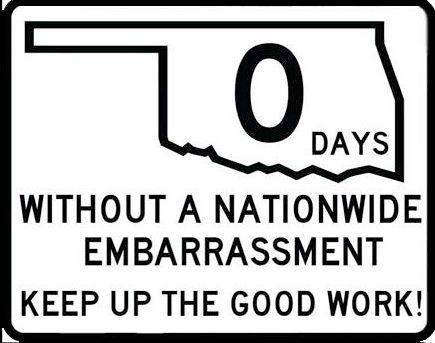 Fake Oklahoma highway route sign. White background with black state outline with "0" as route number and text that says "0 DAYS WITHOUT A NATIONWIDE EMBARRASSMENT  KEEP UP THE GOOD WORK"