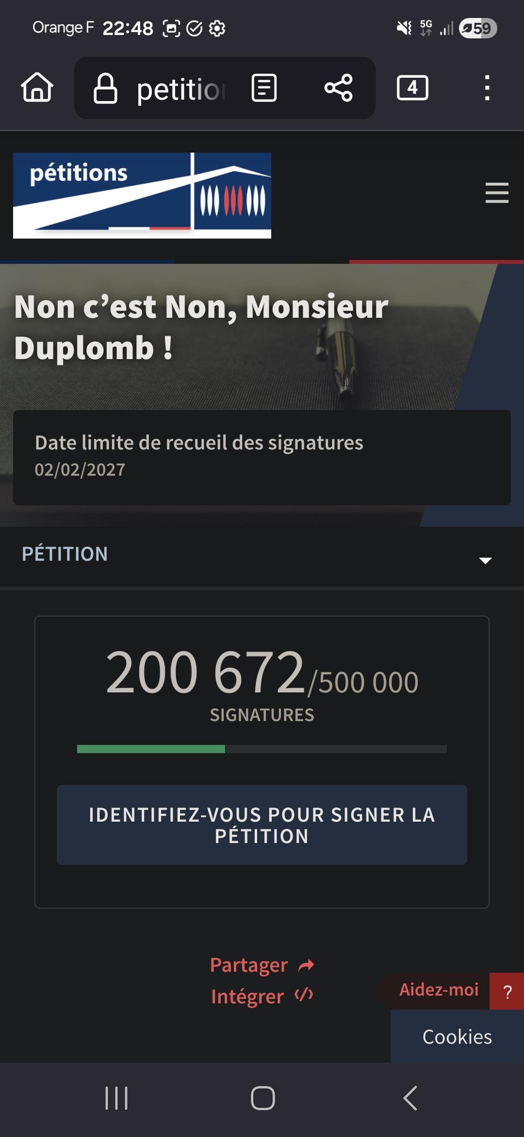 alt Capture d'écran du site des petitions de l'assemblée nationale, sur la page de la pétition contre la nouvelle loi Du plomb "Non c'est non, monsieur Diplomb". Le nombre de signataires affiché est 200 672. Capture d'écran du site des petitions de l'assemblée nationale, sur la page de la pétition contre la nouvelle loi Du plomb "Non c'est non, monsieur Diplomb". Le nombre de signataires affiché est 200 672.