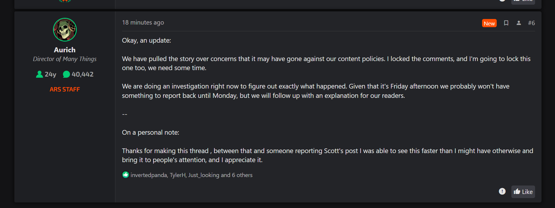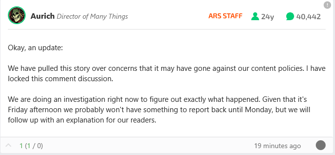 Putting this here so all can see it. Ars forum thread where the pull and investigation are mentioned: https://arstechnica.com/civis/threads/journalistic-standards.1511650/