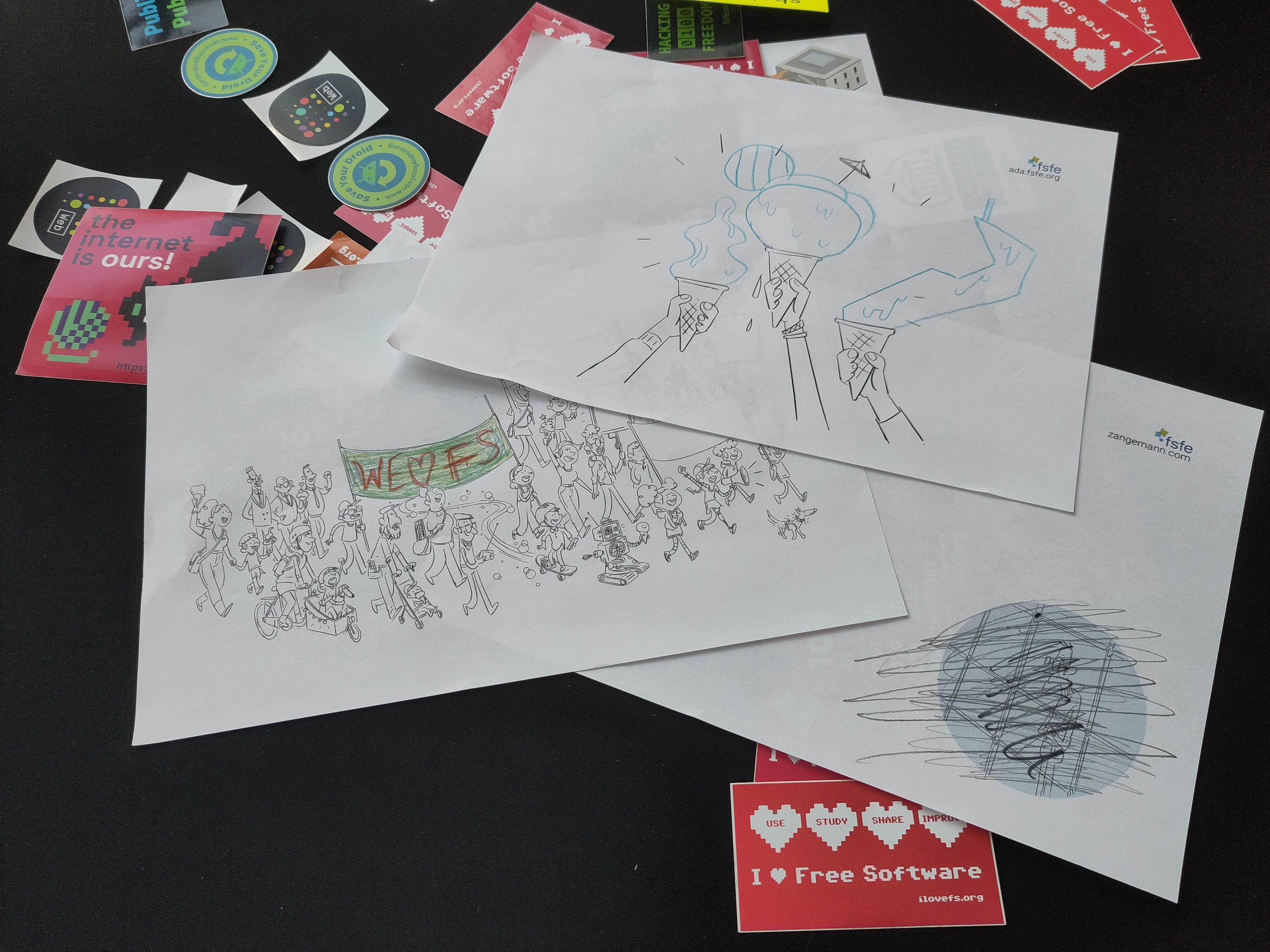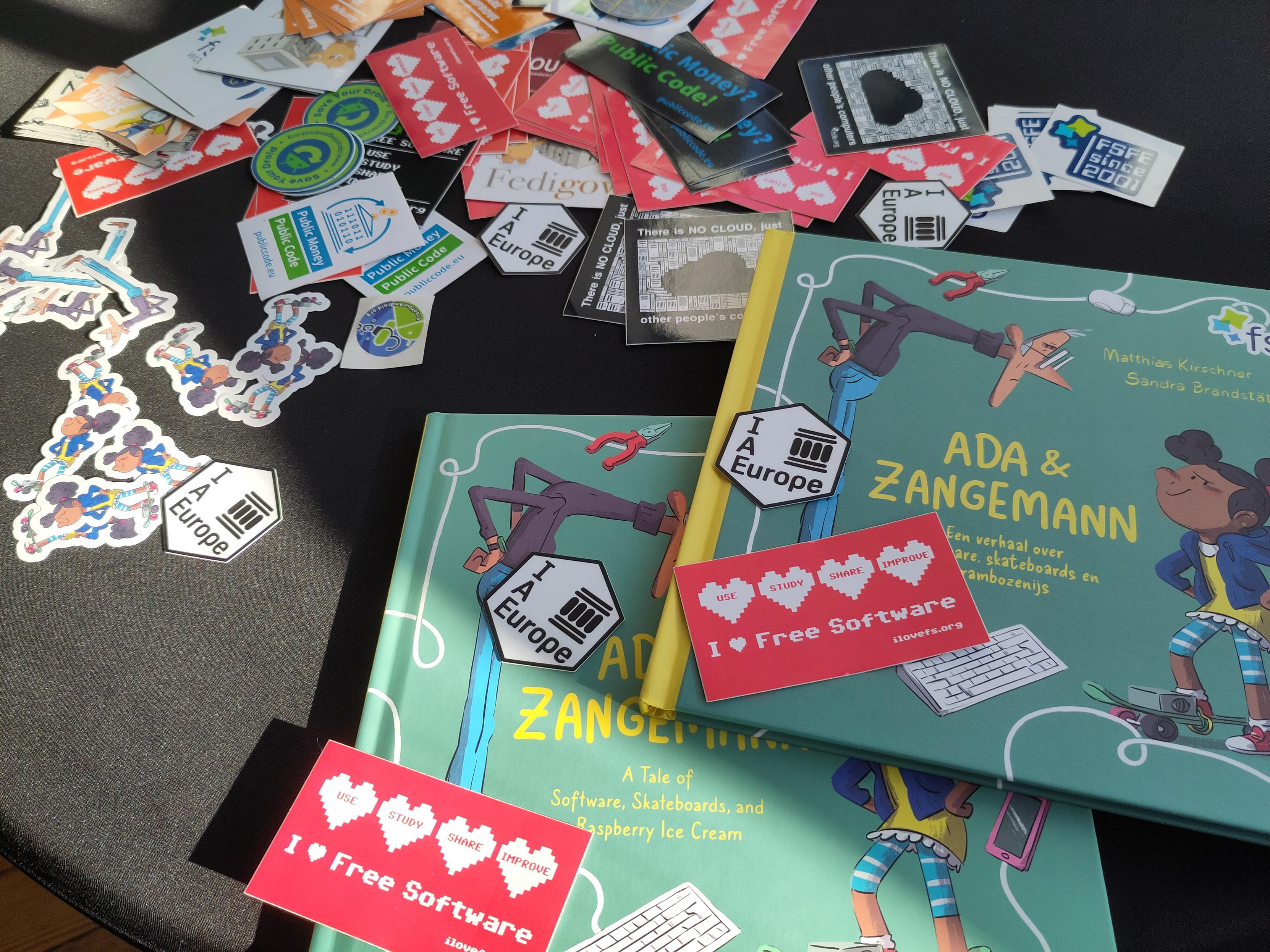 Table with stickers of FSFE and Internet Archive Europe and Ada & Zangemann books.