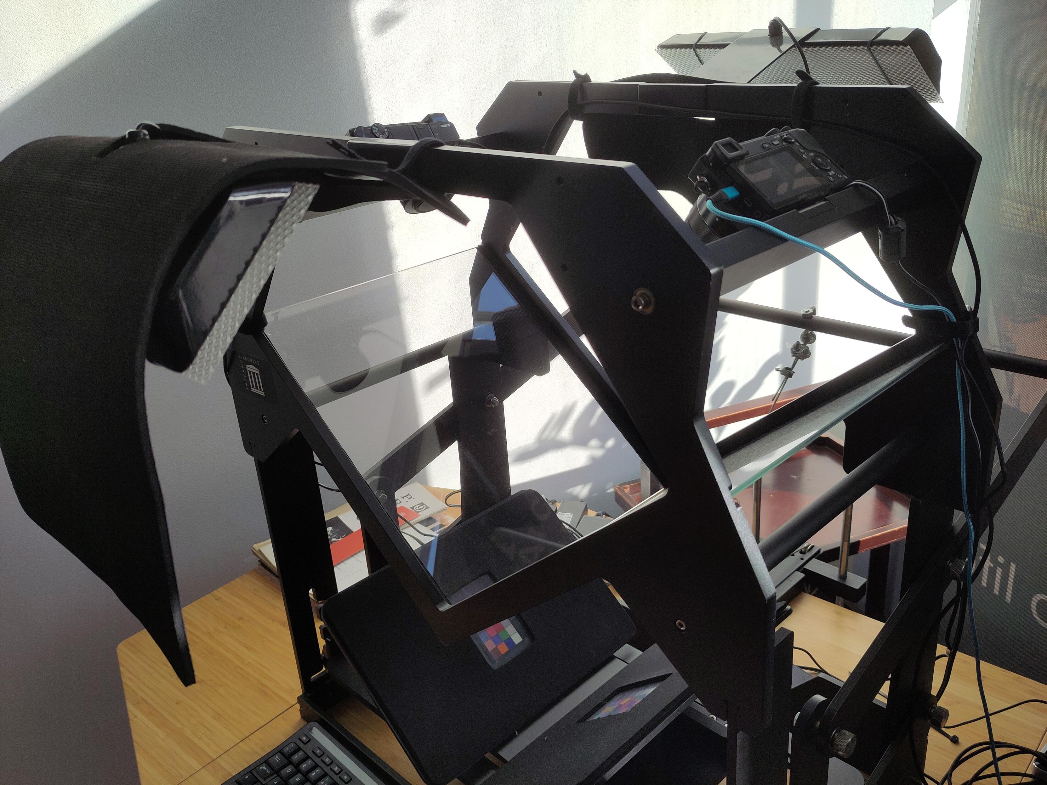 Scribe bookscanner of Internet Archive Europe. Contraption with lights and two cameras to quickly scan a book.