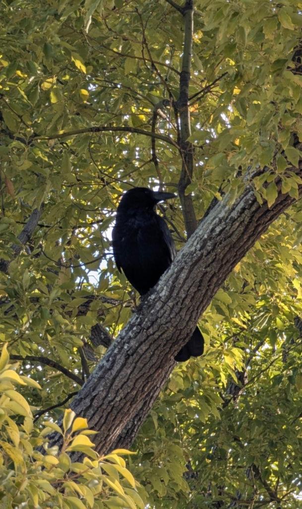 I had to look more to find Mr Crow, but there he was in his tree. He doesn't usually spend time in trees in the morning, so I assume it's to protect himself. ⤵️