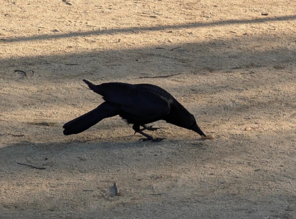 Mr Crow, grabbing a peanut from the ground. While his wings are folded, they "stick out" instead of being along his body as they should.