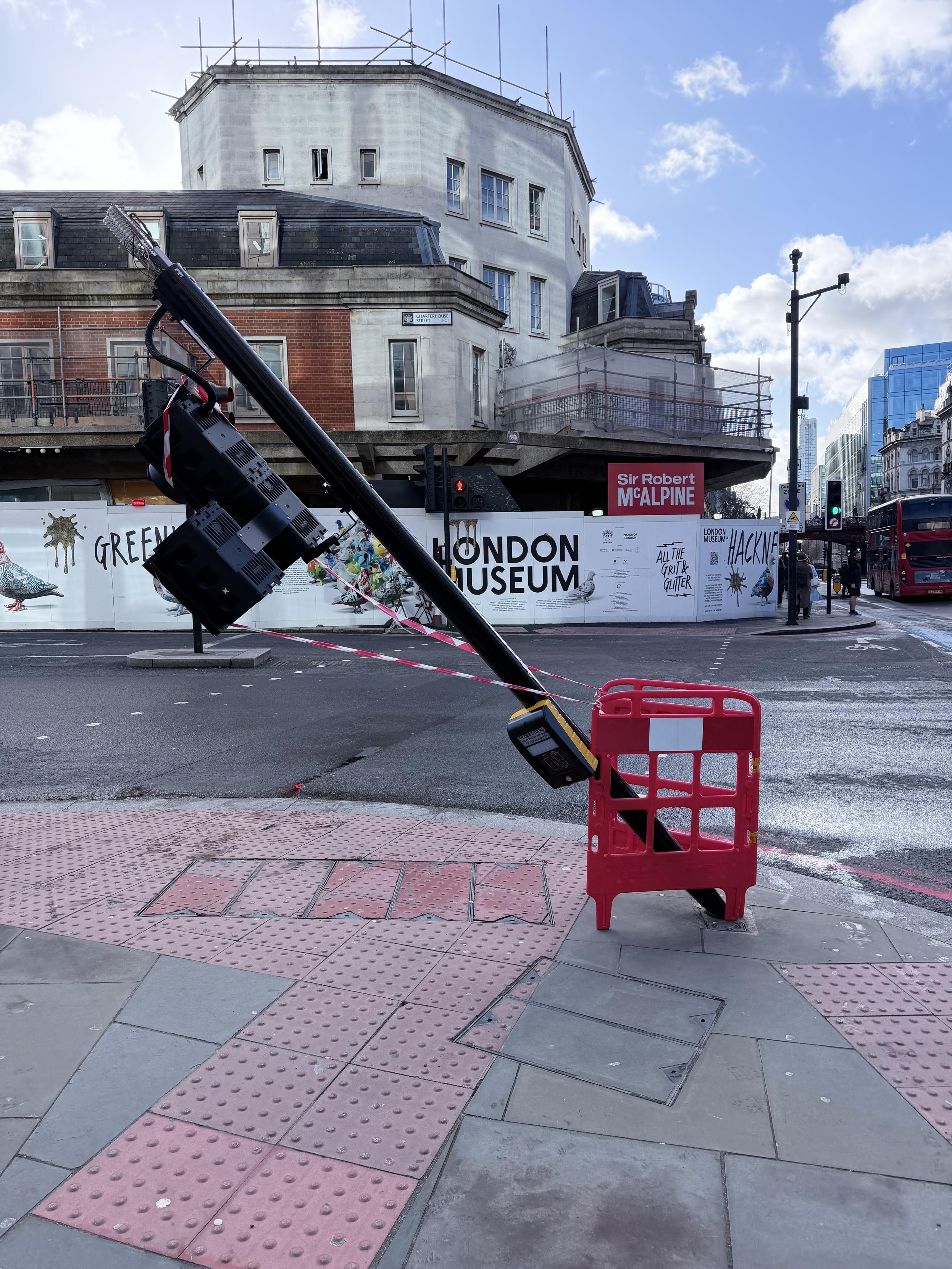A traffic light pole at the corner of a pavement, at a 45掳 angle. Structural red & white tape and a red plastic bollard have been added.