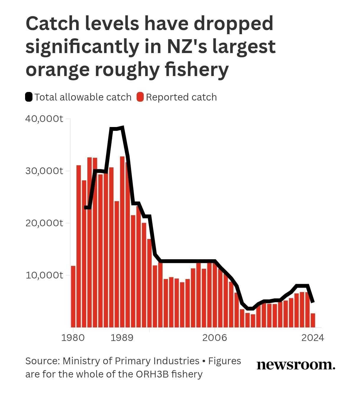 Catch levels have dropped significantly in NZ's largest orange roughy fishery Graph of Total allowable catch and Reported catch Y range goes up to 40,000t (allowed but never caught) X range starts in1980 and ends in 2024 The highest catch was above 30000 ton in the 80s and 90s, then a quick and ongoing decline with last year barely approaching 3000 ton. Source: Ministry of Primary Industries 芦 Figures are for the whole of the ORH3B fishery Newsroom.