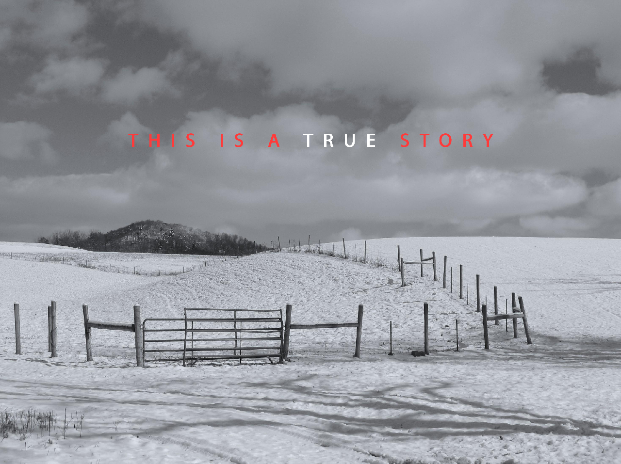 A snow covered landscape where a grazing pasture is fenced off to the left and a field where crops are grown is to the right. In the foreground there is a shadow of a tree. In the background is a tree covered hill also blanketed by snow. Above is a shy with large clouds.