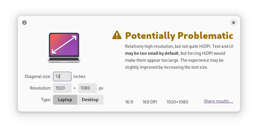 My next phase is probably to rework the results screen; it’s text-heavy which is why I kept the left-alignment for text, but it gets a bit awkward at certain sizes. I’ll probably try out some more Adwaita style widgetry here as well with the icon above and centered text. Maybe reduce the over all text. 🤷