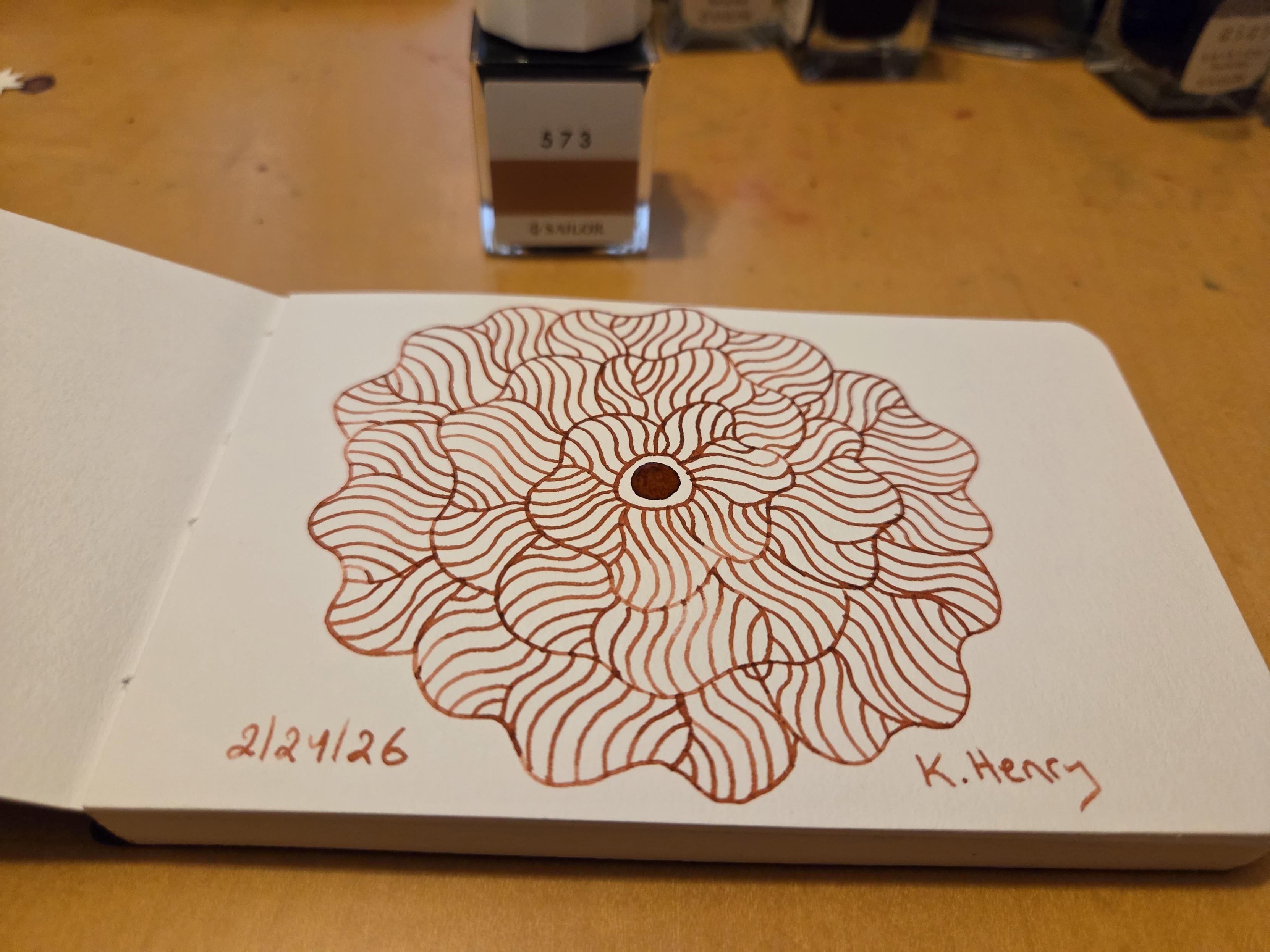 Hand drawn generative/procedural art in ink on an open page of my sketchbook. The abstract pattern is floral. Small bottles of ink can be seen near my sketchbook.