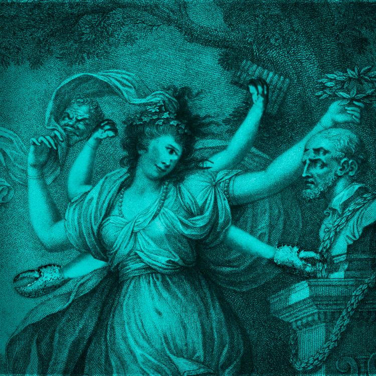 The Muse Thalia, pictured brandishing a comedy mask and putting a laurel wreath on a bust of a bearded figure. It has been altered. The bust has an extra set of eyes and ears. Thalia has two extra sets of arms, one ending in lion's paws, the other in lobster's claws. She has one cyclopean eye. Her comedy mask is now a tragedy mask. The image has been tinted blue.