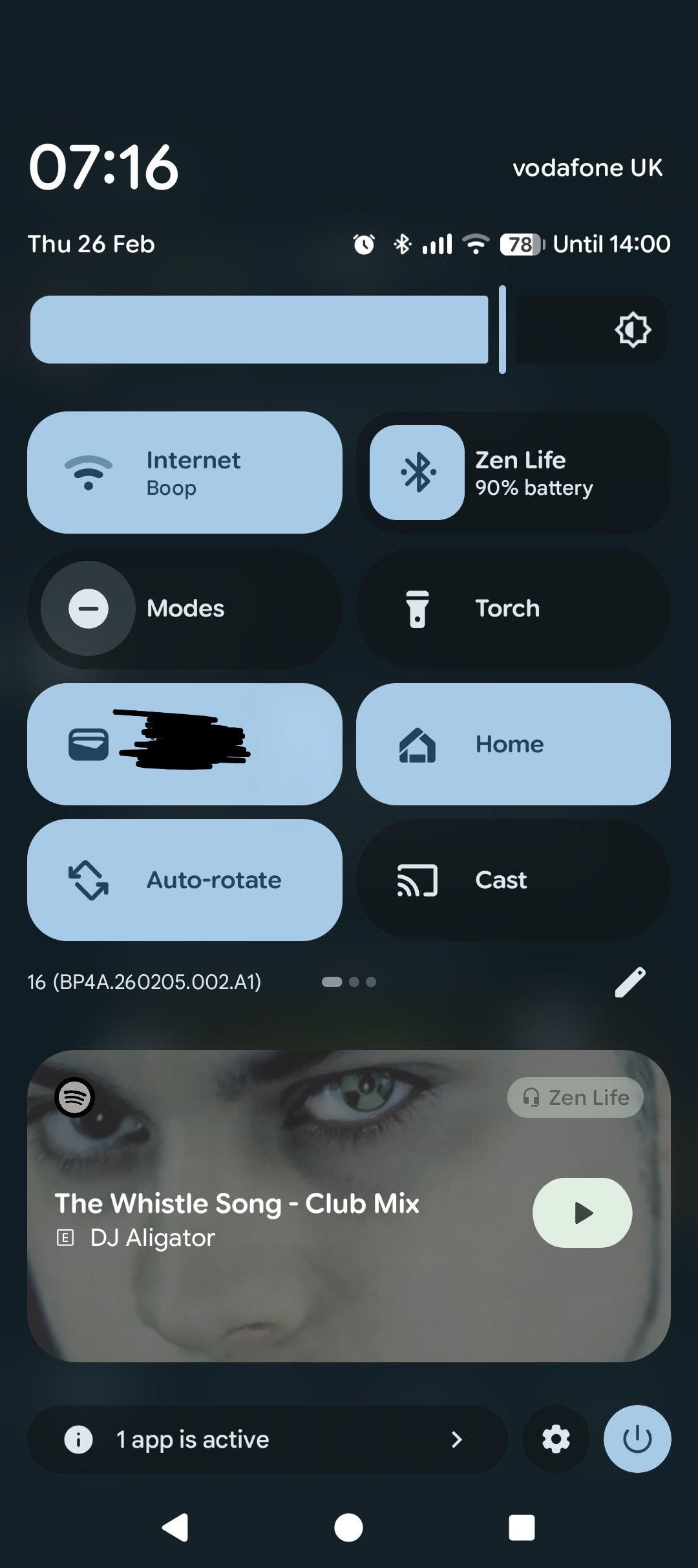 A screenshot of the Android pulldown menu, with the usual menu items. Below is a Spotify notification, which is showing the song DJ Alligator Project - The Whistle Song (Club Mix). The background image is a close up of DJ Alligator's eyes staring directly into your soul.