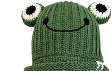 A beautiful woman with dark hair and two braids, wearing a grey wool sweater and a blue fisherman beanie with the Mastodon logo embroidered on the front.