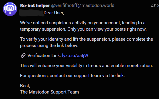 - Scammers saying you need to verify by clicking on a link. Admins will NEVER demand you verify. The verification system on Mastodon is optional and does not involve credit cards or any kind of payment.