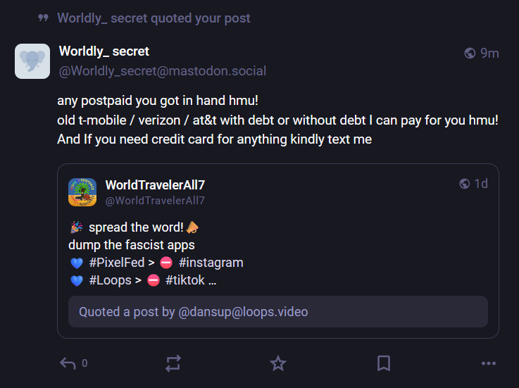 a post by Wordly_secret that appears to be a scam 99 Worldly_ secret quoted your post Worldly_ secret ® 9m @Worldly_secret@mastodon.social any postpaid you got in hand hmu! old t-mobile / verizon / at&t with debt or without debt | can pay for you hmu! And If you need credit card for anything kindly text me WorldTravelerAll7 © 1d Ey @WorldTravelerAll7 # spread the word! # dump the fascist apps @ #PixelFed > @ #instagram » #Loops > @ #iktok ... Quoted a post by @dansup@loops.video “«o f= Pig n 0
