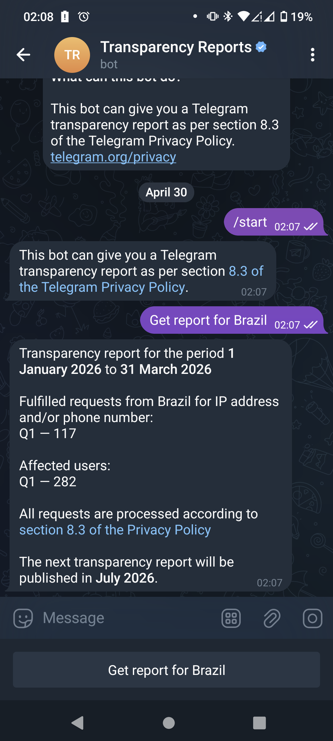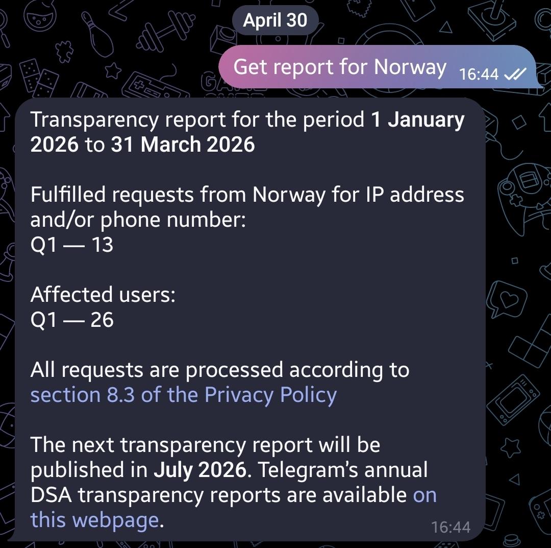 Dear Mastodon friends, Telegram has started to publish their transparency data for Q1 2026. As usual, I am trying to crowdsource this information as it is only accessible per country for Telegram accounts registered with a number for that country. Here is what I have so far, if you have a Telegram account with a number not in that list, please take a screenshot of the @transparency answer and answer here or open an issue here https://github.com/Te-k/telegram-transparency/issues